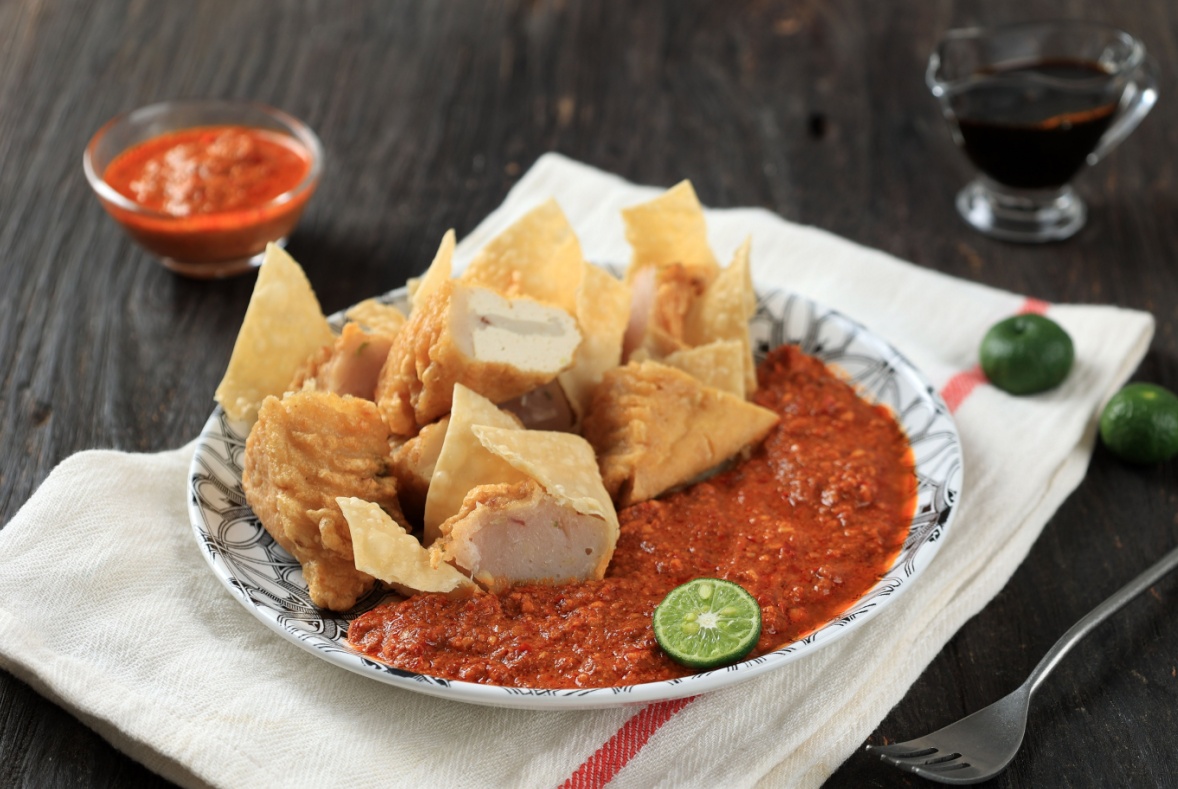 Bakso tahu goreng yang disiram saus kacang kental, perasan jeruk limau, dan kecap manis.