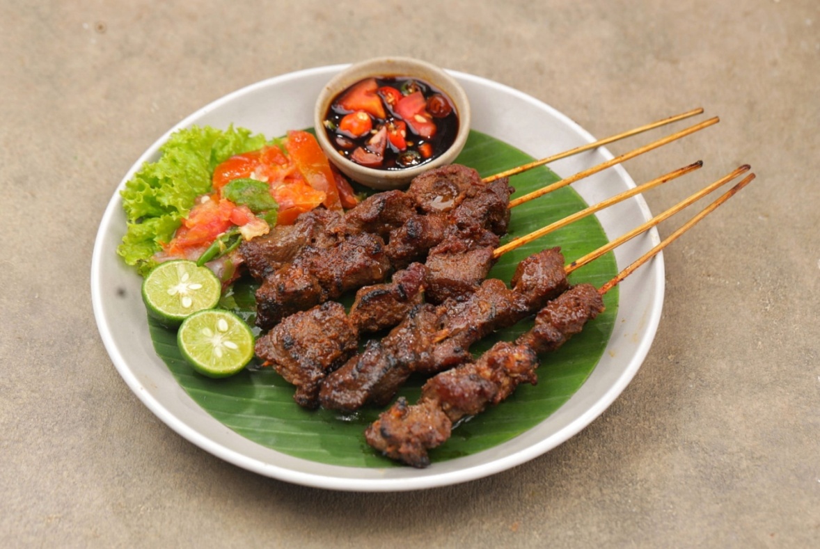 Sate daging sapi atau kambing dengan bumbu rempah meresap, biasanya disantap dengan sambal tomat segar.