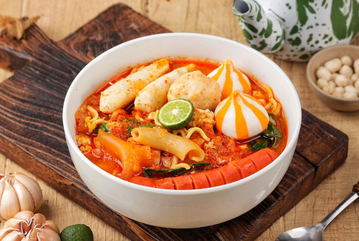 Kerupuk basah yang dimasak dengan bumbu kencur pedas, ditambah bakso, sosis, hingga ceker ayam.