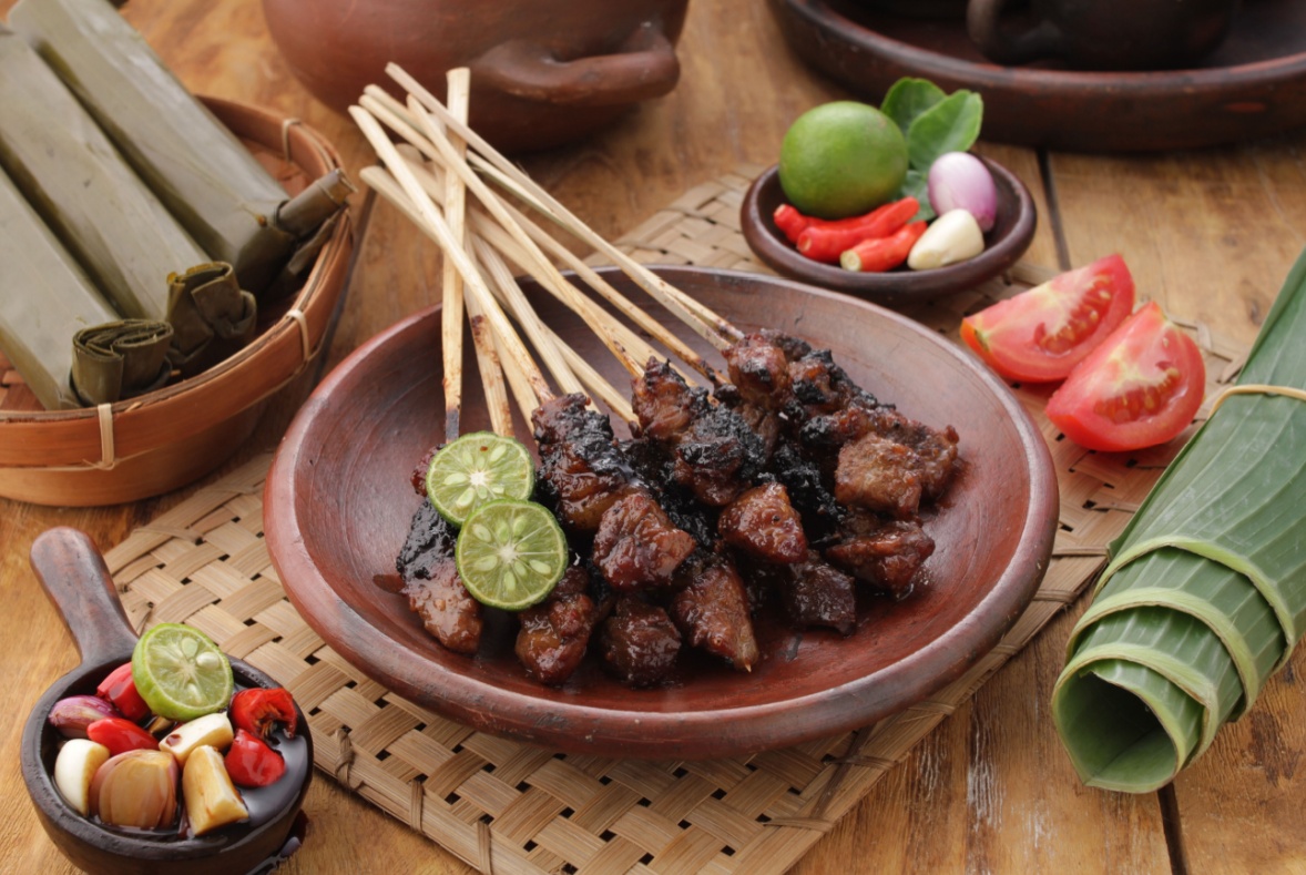 Potongan daging yang besar, teksturnya empuk, lalu dibakar dengan bara kuat sehingga menghasilkan aroma asap yang khas dan bumbunya kecap manis, irisan bawang merah, tomat.