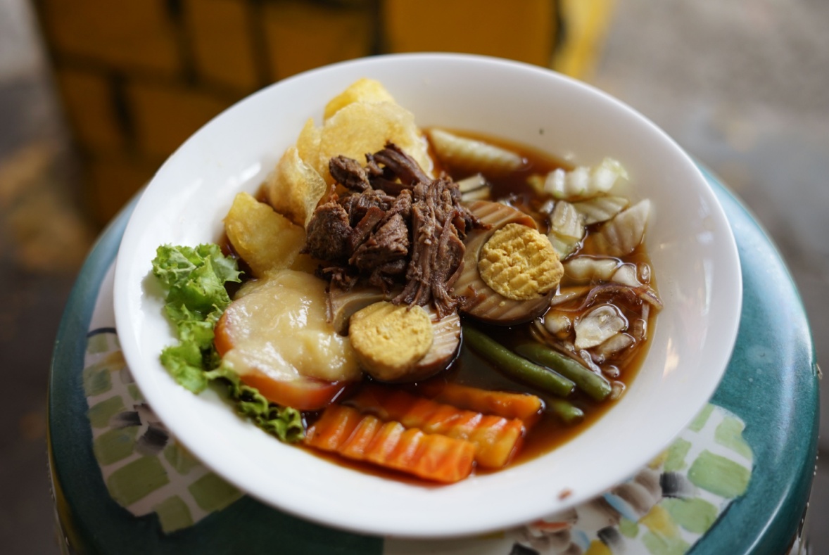 Hidangan dengan campuran daging sapi rebus yang disajikan dengan kuah encer. Disertai kentang goreng, telur pindang, selada, buncis, wortel, acar, dan mustard jawa.