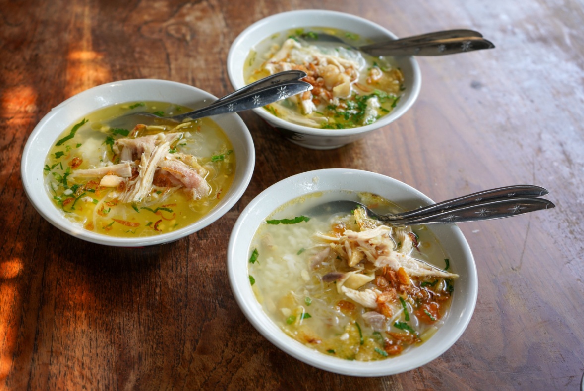 Kuahnya bening, ringan, dan sangat gurih tanpa santan. Dengan komposisi suwiran ayam, bihun, irisan telur rebus, seledri, dan bawang goreng.