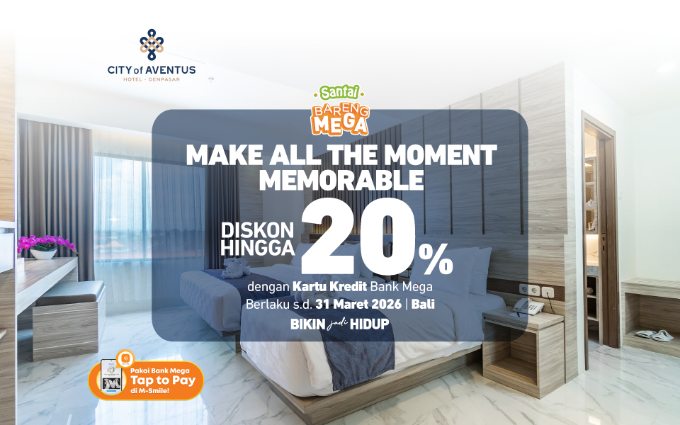 City of Aventus sering dipilih karena nilai dan fasilitas yang seimbang. Dengan promo Kartu Kredit Bank Mega, harga menginapnya jadi lebih ringan. Kamu bisa mengalokasikan dana lebih untuk makan atau aktivitas keluarga.
