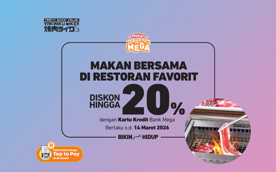 - Diskon 15% berlaku untuk Kartu Kredit Mega Travel Card, Mega Platinum Card, Transmart Mega Card & Mega Metro Card.