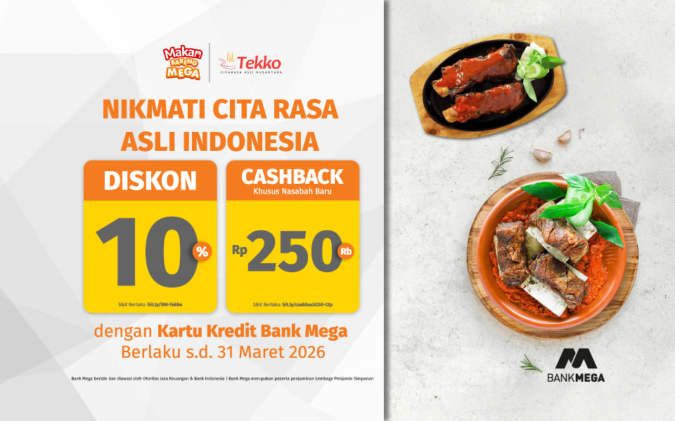 Kalau kamu lagi ngidam menu iga dan masakan khas Indonesia, BM Tekko bisa jadi opsi yang pas. Apalagi, sekarang ada promo dari Bank Mega yang bikin makan jadi lebih hemat, diskon 10% untuk transaksi di BM Tekko, plus opsi cashback Rp250.000 untuk nasabah baru yang ajukan kartu kredit.