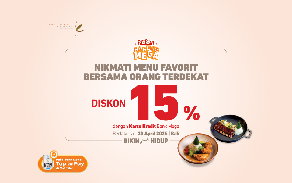 Makan Bareng Bank Mega jadi cara simpel untuk makan enak tanpa bikin dompet kaget. Lewat program ini, kamu bisa dapat diskon 15% saat makan di Kayumanis Seaside. Jadi, momen makan bareng pasangan, sahabat, atau keluarga bisa terasa lebih pas.