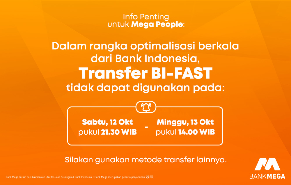 Bank Indonesia akan melaksanakan kegiatan optimalisasi layanan BI-Fast pada Sabtu, 12 Oktober 2024 pukul 21.30 WIB hingga Minggu, 13 Oktober 2024 pukul 14.00 WIB.