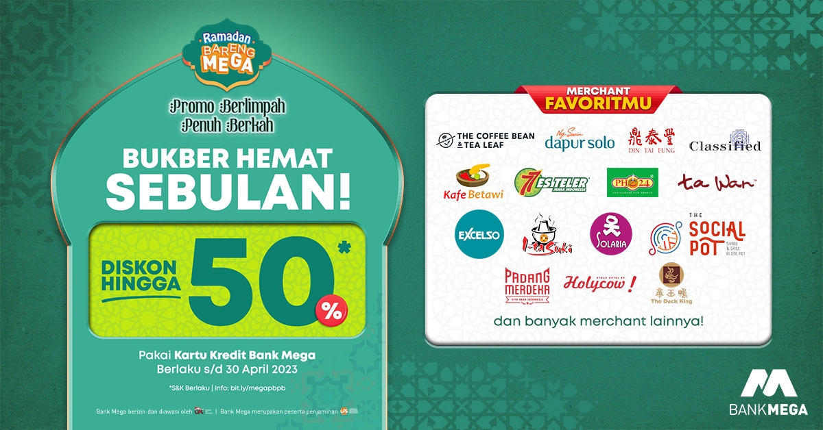 - Berlaku untuk pembayaran dengan Kartu Kredit Bank Mega, kecuali Mega Silver/Classic Card, Mega Corporate Card, Mega Wholesale Card, Mega Groserindo Card, Bank Riau Card dan Bank Sulteng Card.