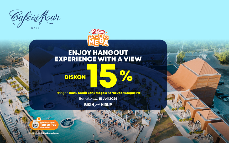 Promo ini berlaku untuk semua jenis Kartu Kredit Bank Mega (kecuali Mega Corporate & Wholesale Card). Pastikan kartu aktif dan siap pakai agar momen liburan makin seru di Cafe Del Mar.