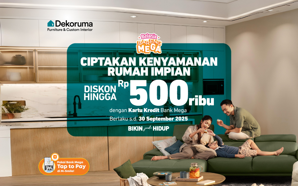 Semua produk ini bisa kamu dapatkan lebih hemat jika bertransaksi dengan Kartu Bank Mega. Jadi, sambil menata rumah impian, kamu juga bisa tetap jaga kondisi keuangan tetap sehat.
