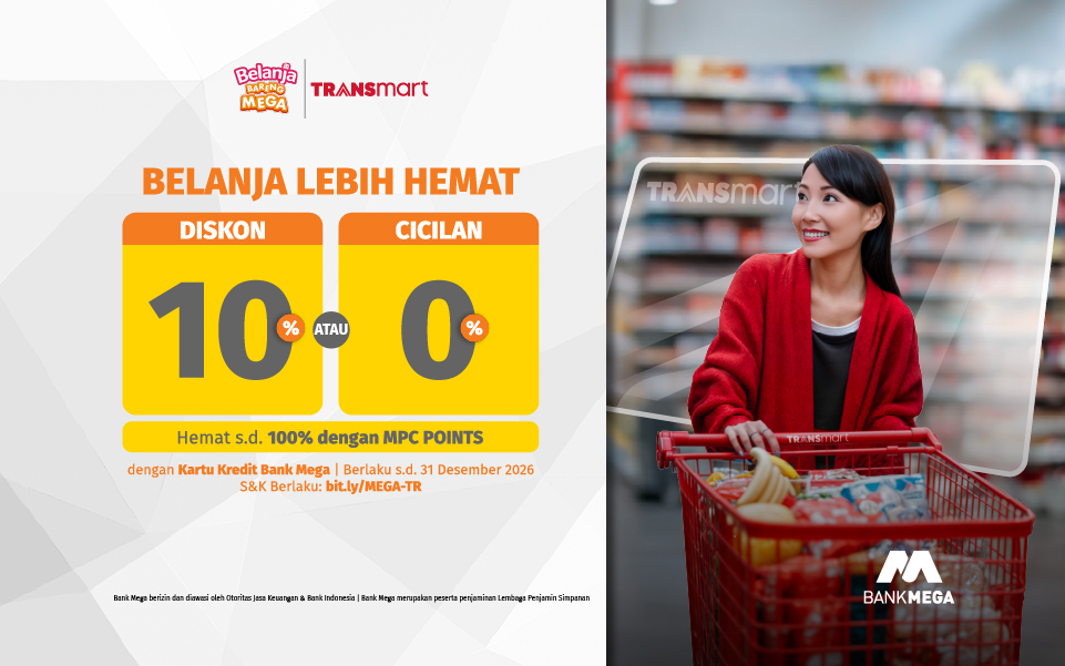 Menjelang momen Lebaran dan berbagai kebutuhan sambut hari besar, belanja kebutuhan harian jadi lebih hemat dengan berbagai promo menarik dari Bank Mega. Mulai dari diskon belanja di Transmart, penawaran spesial di Voila baik offline dan online, potongan harga di Tokopedia, hingga promo dari Metro.