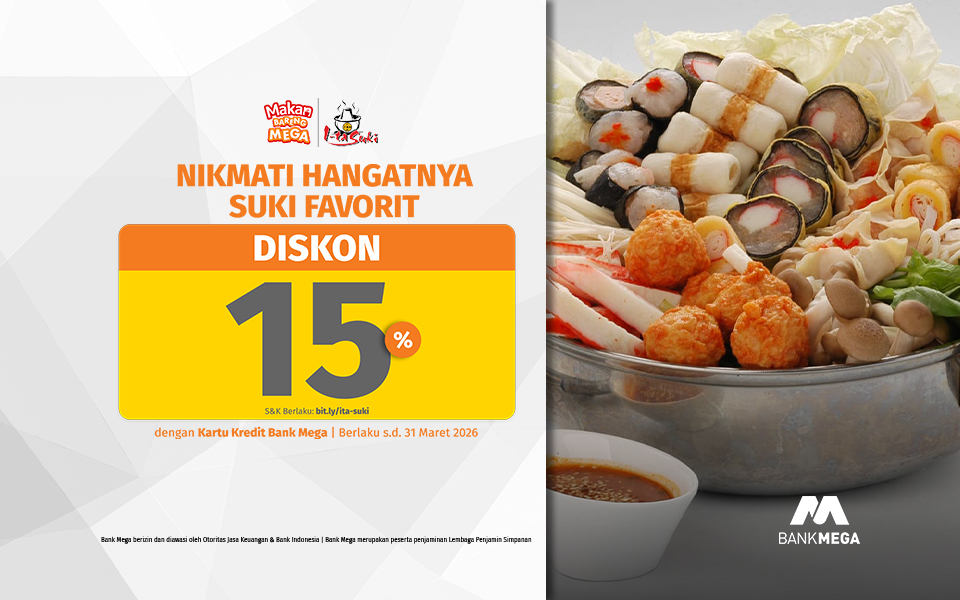 Kabar gembira bagi Anda para pecinta kuliner rebusan (suki) dan panggangan. Bank Mega kembali memanjakan nasabahnya dengan promo spesial. Kini, momen makan besar bersama keluarga atau rekan kerja di I-ta Suki bisa lebih hemat dengan diskon 15%.