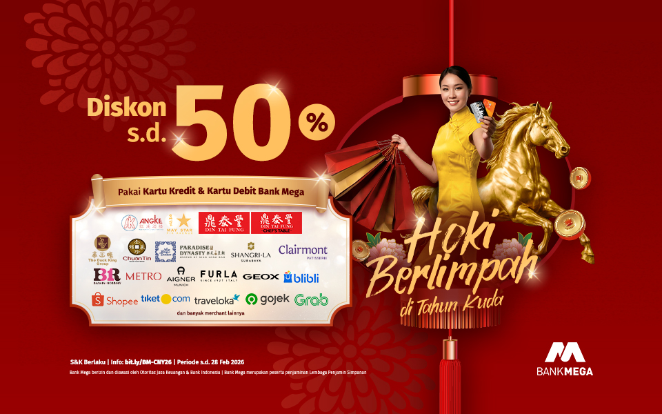Sambut Imlek dengan penuh ceria dan “Hoki Berlimpah” bersama orang-orang tersayang! Agar momen kumpul makin berkesan tanpa boros, nikmati promo imlek hingga 50% khusus pemegang Kartu Bank Mega.