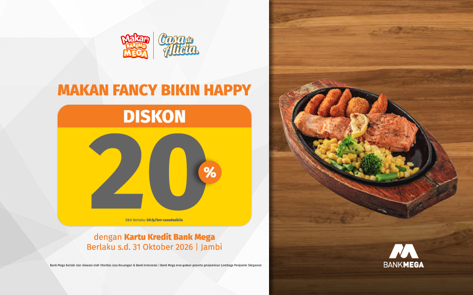 - Berlaku untuk Kartu Kredit Bank Mega, kecuali Mega Silver Card, Mega Barca Card, Mega Corporate Card, Mega Groserindo Card, Mega Wholesale Card, Bank Riau Card dan Bank Sulteng Card.