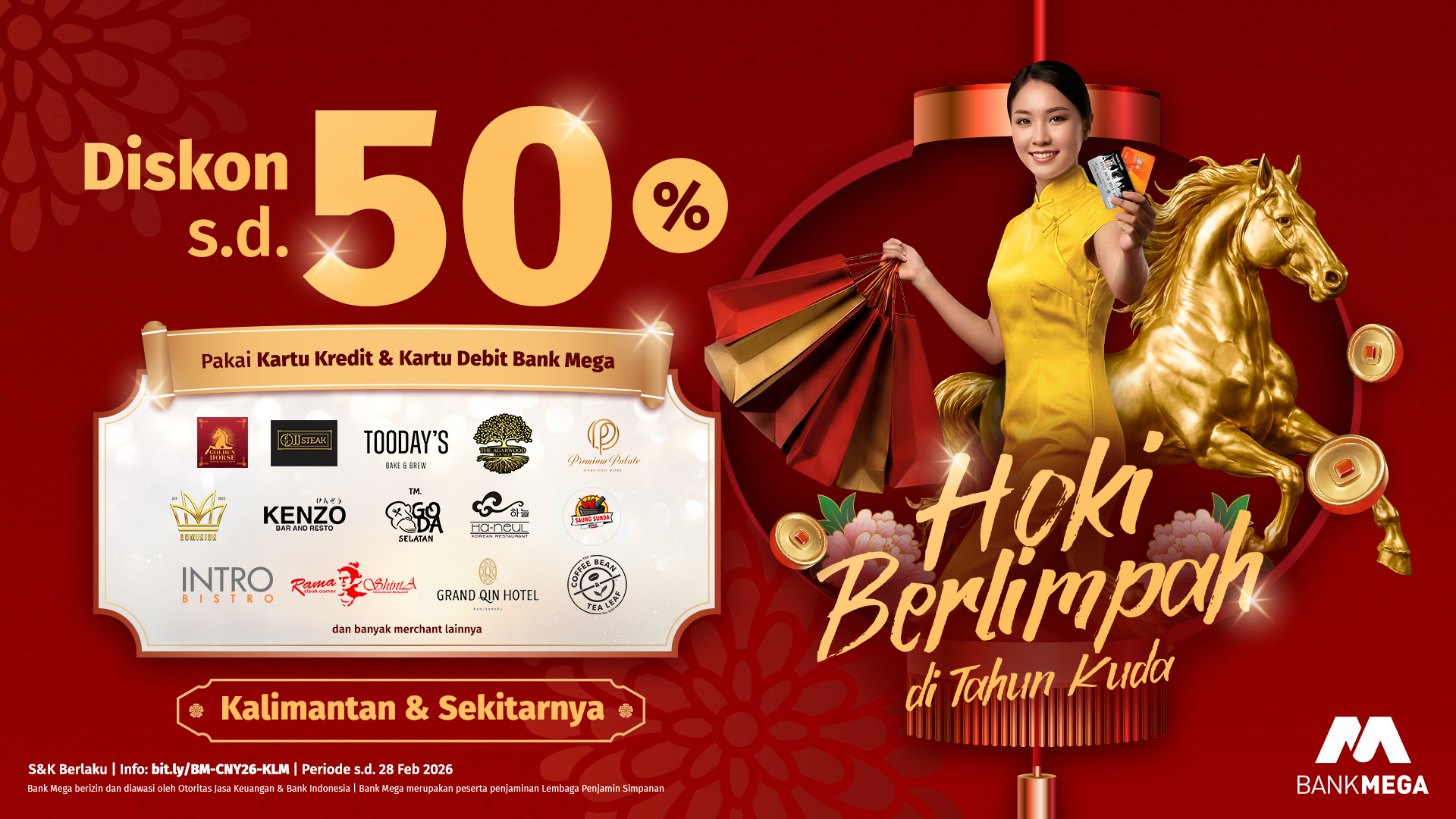 Merayakan momen Imlek di Kalimantan kini makin seru dan hemat! Bagi Anda yang berada di Balikpapan dan Samarinda, nikmati kebersamaan bersama keluarga di berbagai restoran pilihan dengan diskon hingga 20% khusus pemegang Kartu Kredit Bank Mega. Mulai dari santap siang santai sampai makan malam mewah khas Imlek, semua bisa Anda nikmati dengan harga yang lebih terjangkau. Yuk, cek daftar lengkap promo dining CNY 2026 di wilayah Kalimantan di bawah ini dan buat perayaan Anda makin meriah!