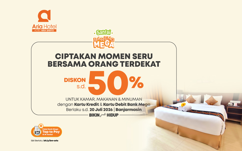 - Diskon 15% berlaku untuk Kartu Debit MegaFirst, Kartu Kredit MegaFirst Infinite, dan Mega Travel Card (maksimum diskon Rp225.000,-).