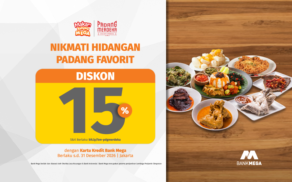 Makan di Padang Merdeka kini lebih hemat dan menyenangkan dengan diskon 15% menggunakan Kartu Kredit Bank Mega. Jangan lewatkan kesempatan untuk menikmati hidangan khas Padang dengan cita rasa autentik bersama keluarga atau teman.