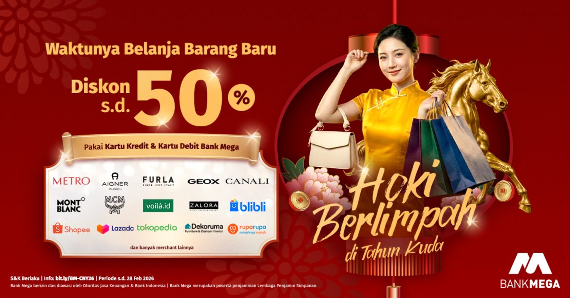 Gong Xi Fa Cai! Rayakan kemeriahan Imlek 2026 dengan mewujudkan barang impianmu. Nikmati promo “Hoki Berlimpah” dengan Kartu Bank Mega untuk shopping seru di pusat perbelanjaan favorit. Belanja kebutuhan hari raya jadi lebih mudah, mewah, dan pastinya lebih hemat. Cek katalog promonya di bawah ini!