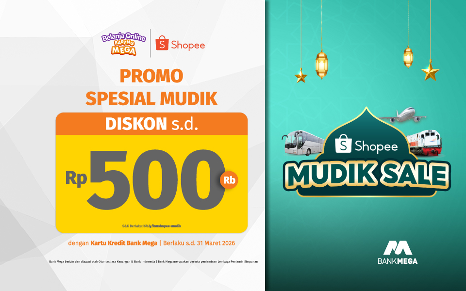 Shopee Mudik Sale merupakan promo yang berlaku untuk mudik dan bayar pakai Kartu Kredit Bank Mega. Program ini berlaku hingga 31 Maret 2026 dan bisa dapat potongan hingga Rp500.000 dengan minimum transaksi Rp2.000.000.