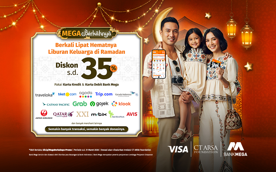 Menjelang musim liburan, rencana jalan-jalan jadi makin seru untuk disiapkan. Mulai dari pesan tiket pesawat, booking hotel, hingga pilih paket tour impian, semuanya bisa kamu nikmati lebih hemat lewat Promo Traveling dari Kartu Kredit dan Debit Bank Mega. Beragam penawaran menarik tersedia di merchant pilihan, sehingga liburan terasa lebih ringan di kantong. Lebih istimewa lagi, setiap transaksi yang kamu lakukan tak hanya memberi keuntungan untuk perjalananmu, tetapi juga turut mendukung donasi paket pendidikan dan sembako melalui CT ARSA Foundation dalam program Mega Berkahnya Ramadan 2026. Jadi, liburan tetap menyenangkan, berbagi pun tetap berjalan.