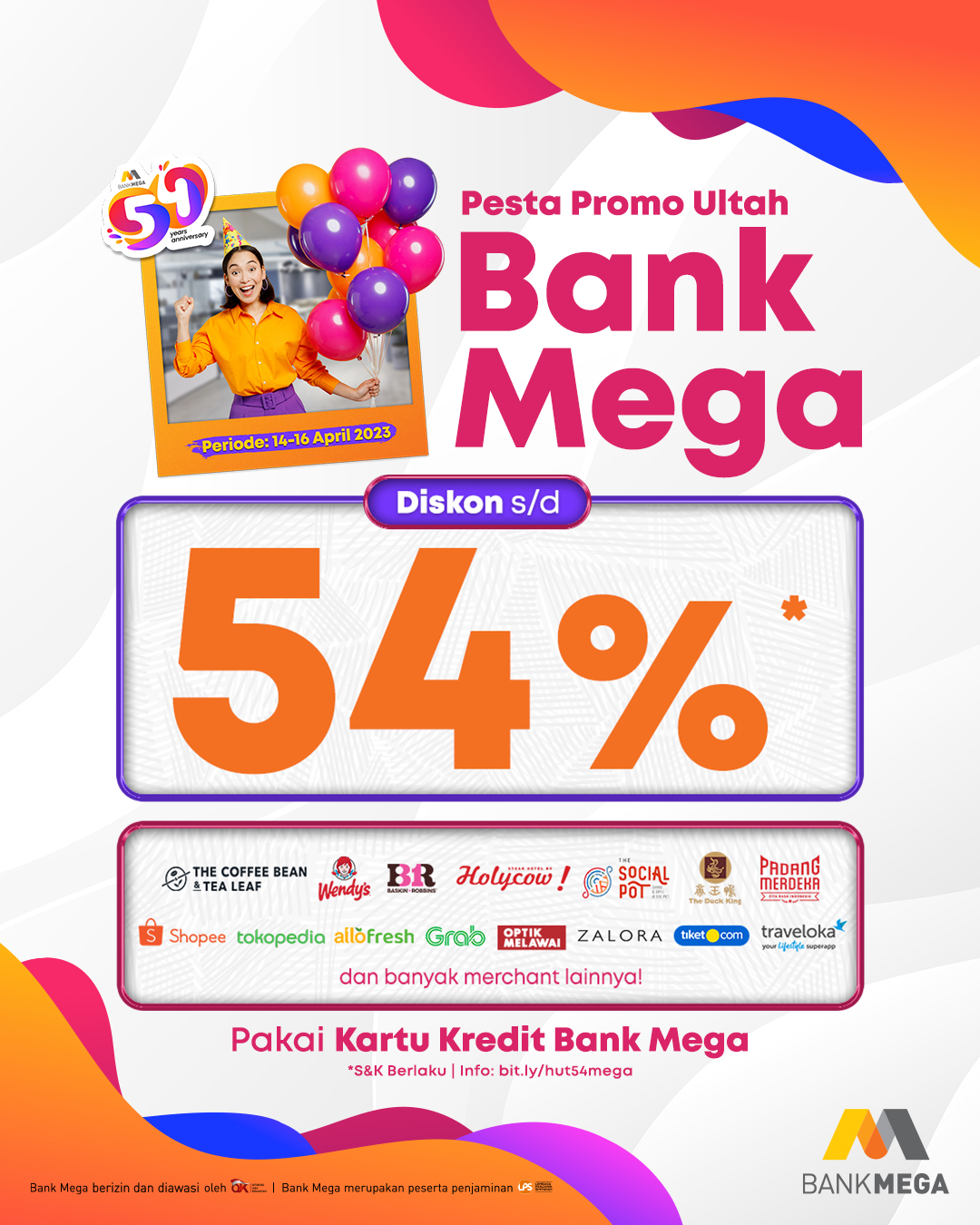 Bank Mega balik lagi nih ada diskon yang sangat luar biasa yaitu sampai dengan 54% dalam rangka memperingati Hari Ulang Tahun (HUT) ke 54, Semoga panjang umur dan jaya selalu. Yuk, buruan belanja dan shopping di Pesta Promo Ultah Bank Mega Diskon hingga 54% dengan bertransaksi belanja kamu memakai Kartu Kredit Bank Mega, kalo belum punya Apply disini ya. Kamu bisa tampil ekspresikan gaya belanjanmu bersama Bank Mega.