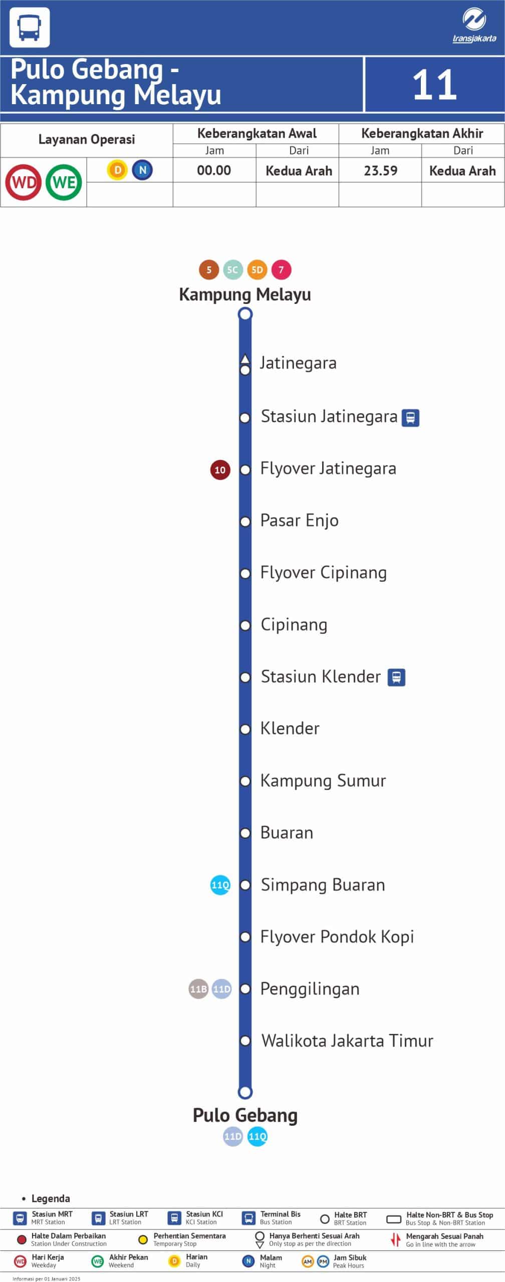 Daftar di atas selaras dengan informasi rute Koridor 11 yang menempatkan Pulo Gebang sebagai pemberhentian awal/akhir serta melewati halte-halte seperti Walikota Jaktim, Penggilingan, Simpang Buaran, Buaran, Klender, Stasiun Klender, Cipinang, Pasar Enjo, Flyover Jatinegara, Stasiun Jatinegara, Jatinegara hingga Kampung Melayu.